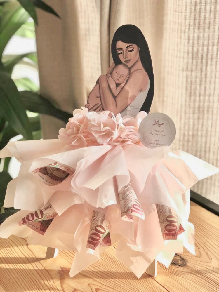 ستاند خشبي مزين بورد الهدرنجا وأوراق التيشو مع رسمة مناسبة لمناسبة الهديةأبعاد المنتج القاعدة 28 سم ارتفاع 38 سم
